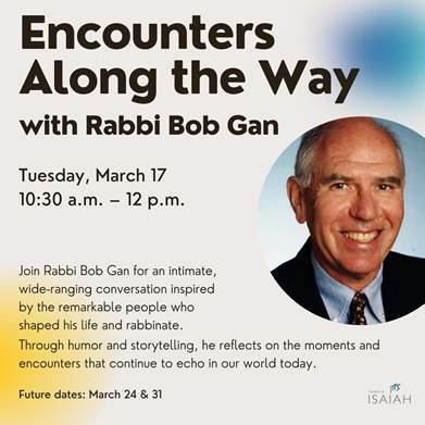 You are invited to join Rabbi Bob Gan for an intimate, wide-ranging conversation shaped by the remarkable individuals who have crossed his path. Through humor, storytelling, and insight. Rabbi Gan reflects on the people, moments, and unexpected meetings that left a lasting imprint on his life and rabbinate.